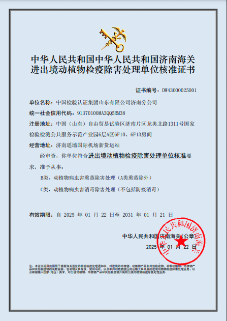 1月22日,山东公司所属济南分公司获批中华人民共和国济南海关颁发的“进出境动植物检疫除害处理单位核准证书”,具备从事B类动植物病虫害熏蒸除害处理(A类熏蒸除外)和C类动植物病虫害消毒除害处理(不包括防疫消毒)相关业务资质。