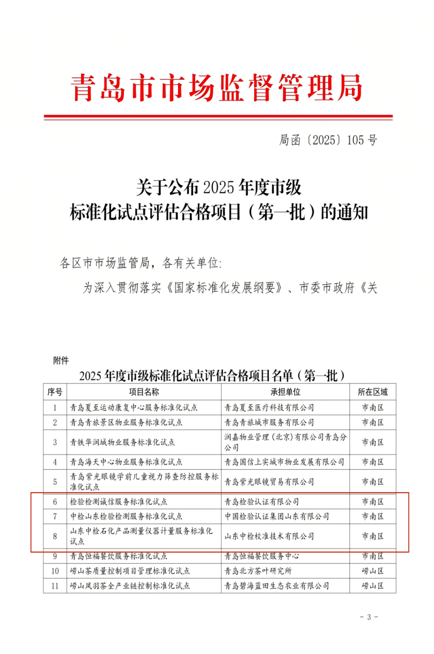 近日,2025年度市级标准化试点评估合格项目名单正式发布。中国检验认证集团山东有限公司、青岛检验认证有限公司及山东中检校准技术有限公司凭借在标准化体系建设、技术创新与实践应用方面的扎实成效,成功通过评估,同步入选合格名单。这是深入贯彻落实集团标准化体系建设要求的重要成果,不仅标志着山东公司在标准化、专业化、规范化发展方面迈出关键一步,还为集团构建高质量标准体系、提升行业影响力提供了有力支撑。